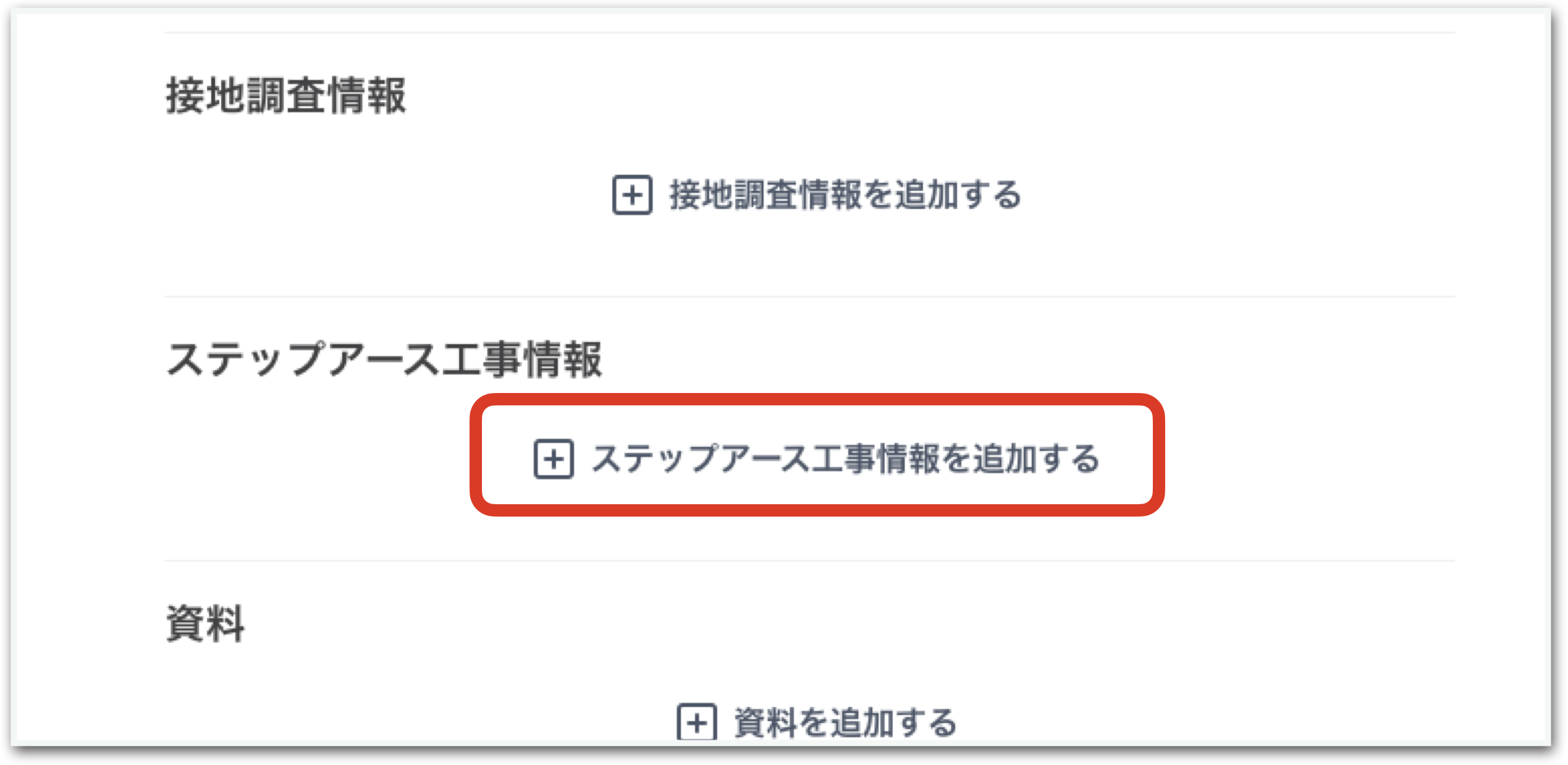 ステップアース工事情報の登録は該当するアースカルテ詳細ページの+ステップアース工事情報を追加するから登録ページに移動し情報を入力します。