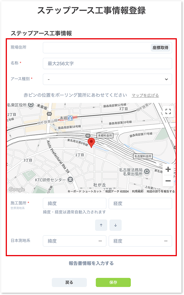 現場住所、名称、アース種別を入力し、ピンを該当の箇所に移動させると緯度経度は自動で入力されます。