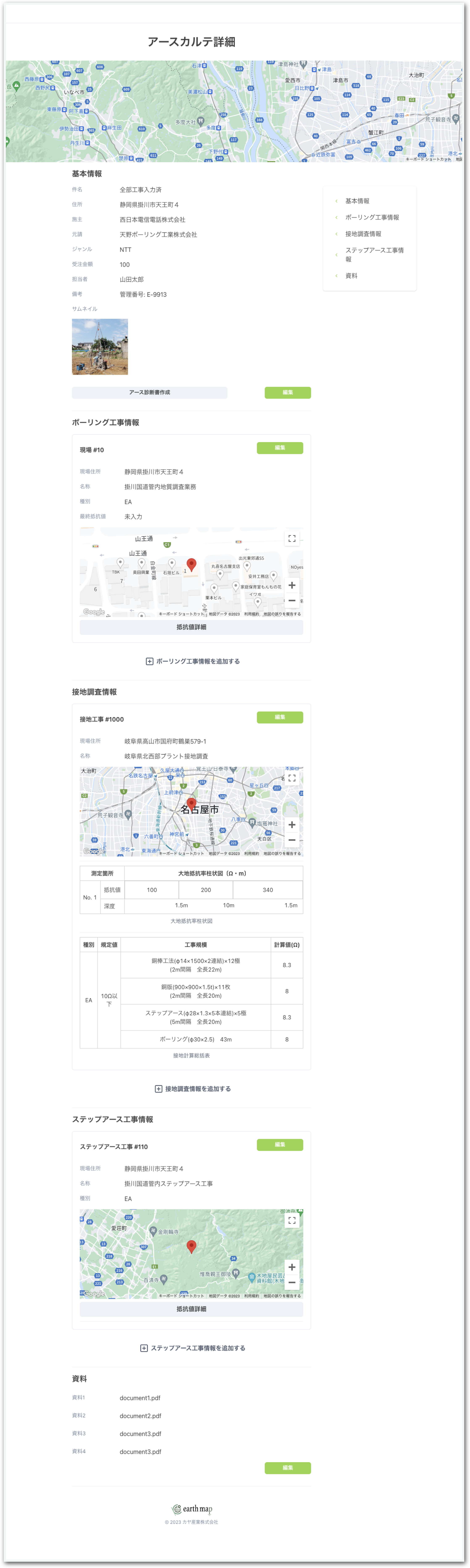 アースカルテアースカルテ詳細アースカルテ詳細 アースカルテの構成は上から 基本情報 ボーリング工事情報 接地調査情報 ステップアース工事情報 資料 となっており、各項目で入力されたものが表示されます。 ボーリング工事情報とステップアース工事情報は抵抗値詳細ボタンより詳細な情報を見ることができます。ステータスについて抵抗値について