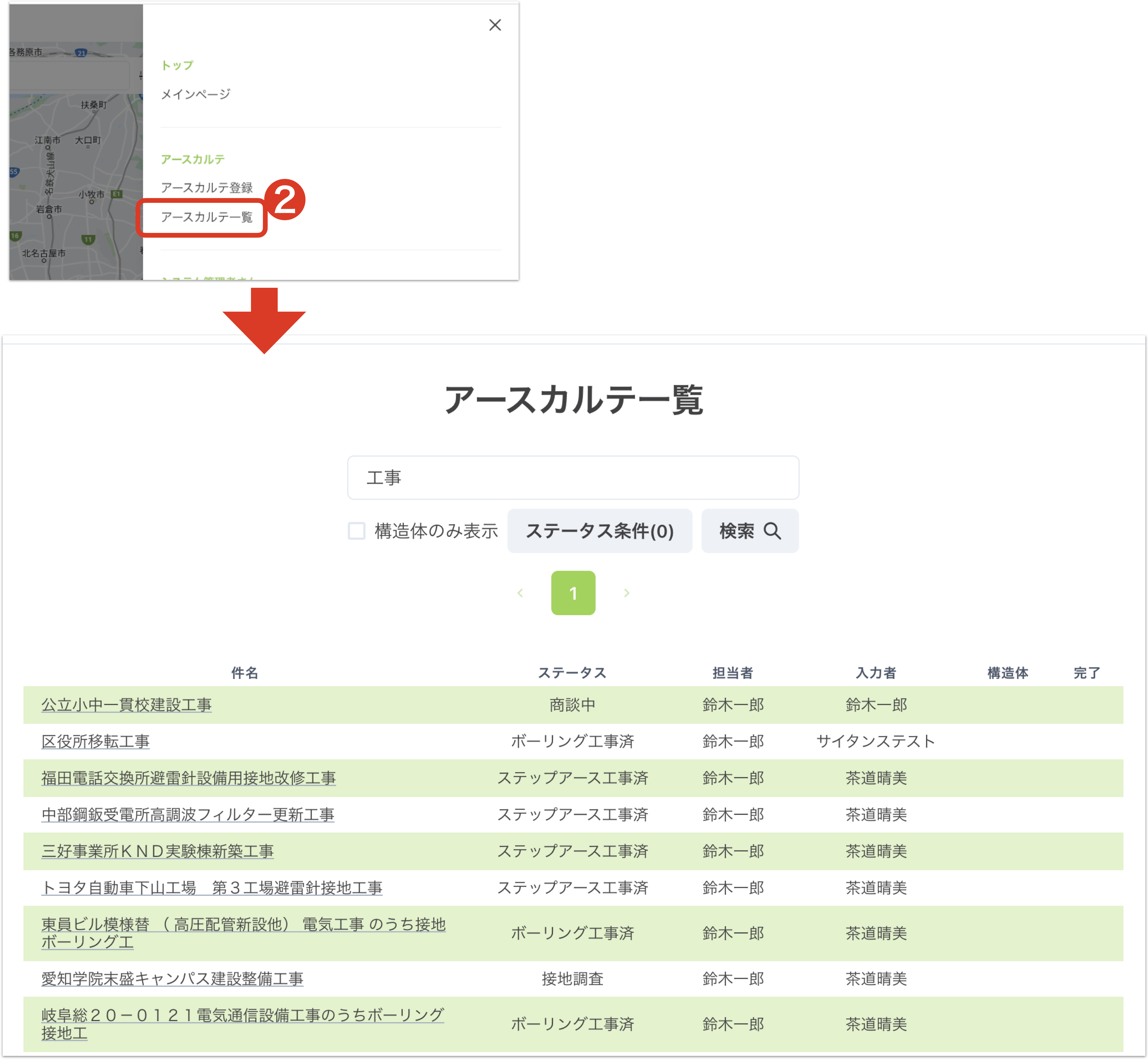 アースカルテアースカルテ検索アースカルテ検索 アースカルテの検索の仕方は2通りあります。 ❶住所(マップパネル)からアースカルテを探す方法 メニュー内の❷アースカルテ一覧からアースカルテ一覧ページへ遷移し探します。 アースカルテ一覧では施主、地名、担当者等で検索できます。 ステータス表示により案件の状態が一目でわかります。 担当者には案件を誰が担当したか、入力者にはアースカルテの作成者の名前が表示されます。ヘッダーステータスについて
